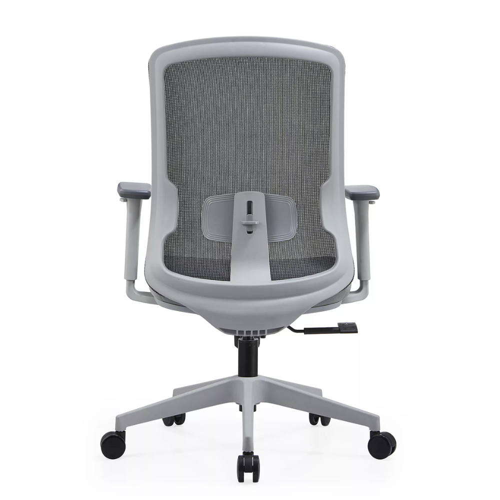 Seu encosto em tela de nylon com poliéster permite ventilação contínua, reduzindo o acúmulo de calor durante a jornada de trabalho. O apoio lombar integrado auxilia na manutenção da curvatura natural da coluna, promovendo postura adequada.