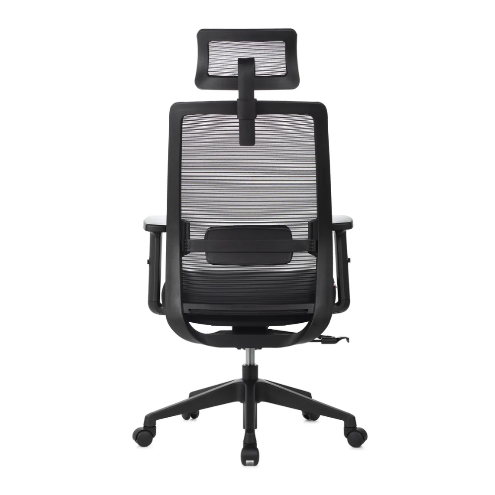 O modelo conta com apoio de cabeça em tela com regulagem de altura e rotação, oferecendo suporte cervical adequado para cargos executivos e funções que demandam permanência prolongada na posição sentada.