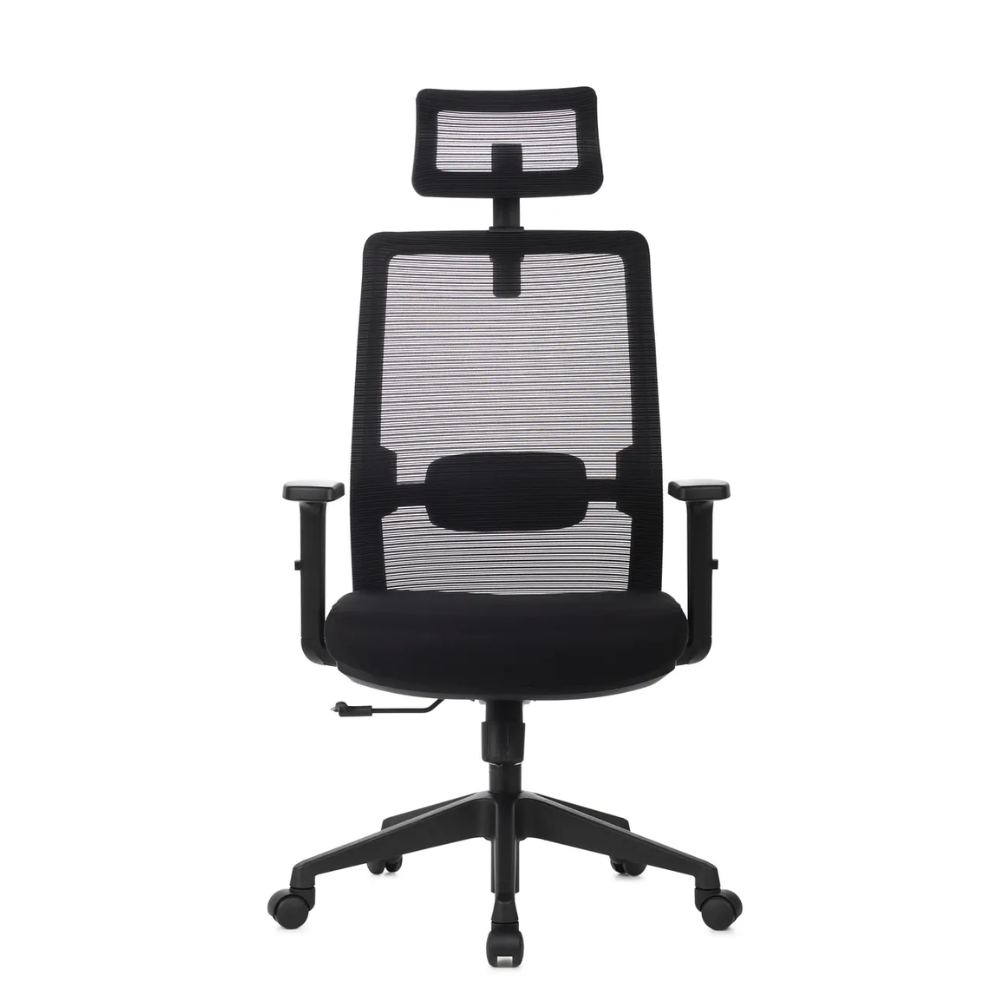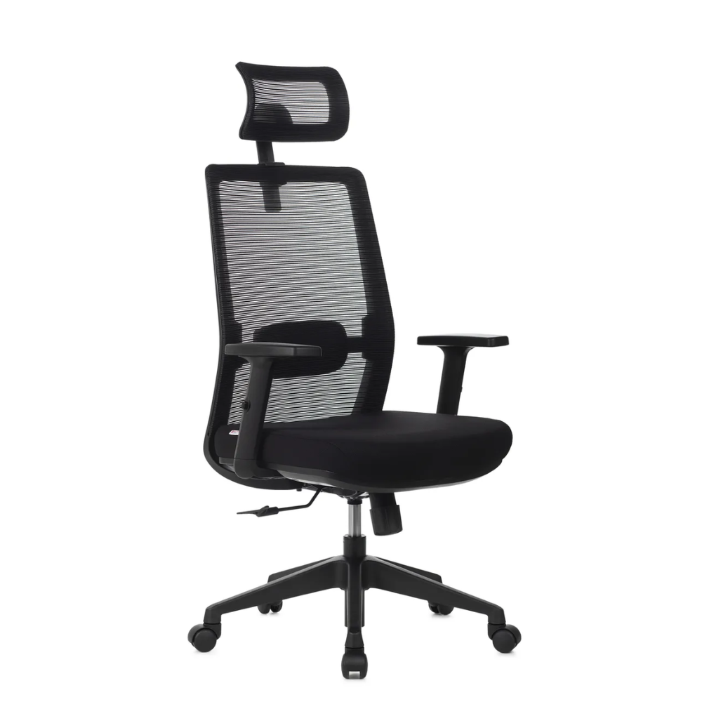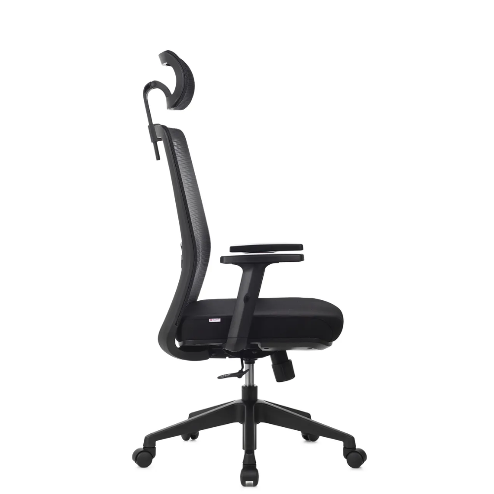 A Cadeira Vitalis Presidente pode ser configurada com ou sem apoio de cabeça em tela, que possui regulagem de altura e rotação, oferecendo suporte adicional para a região cervical.